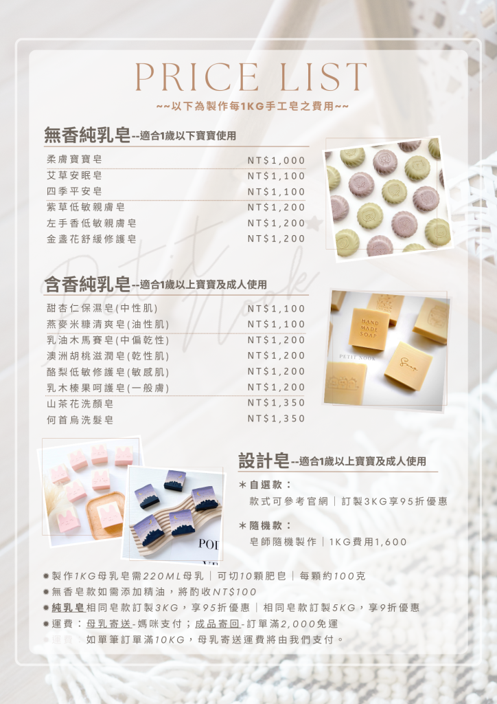 肥皂本質是清潔肌膚,為了讓手工皂價格更親民,特別調整了純乳皂代製費用,大量製作價格越低,平均一顆不到市售手工皂1/3,又可以消滅母乳😉